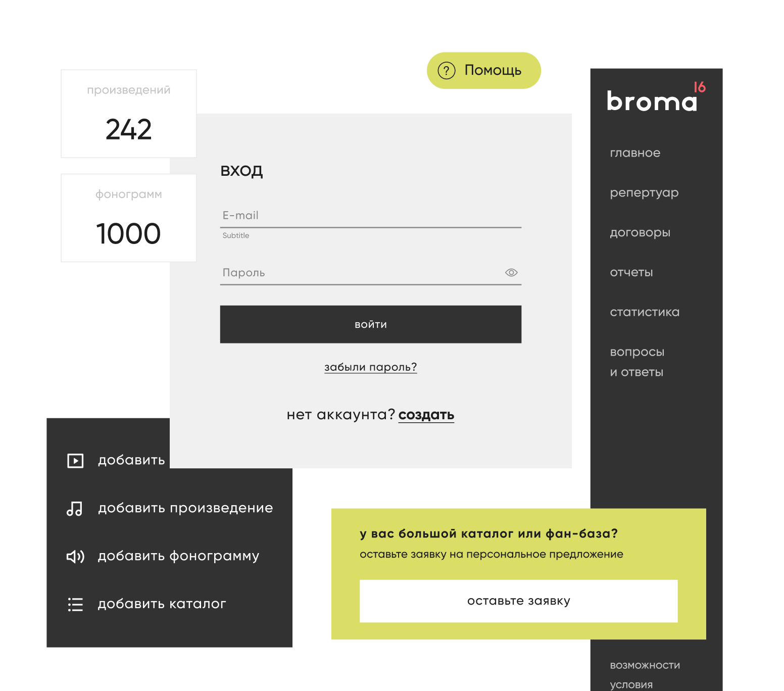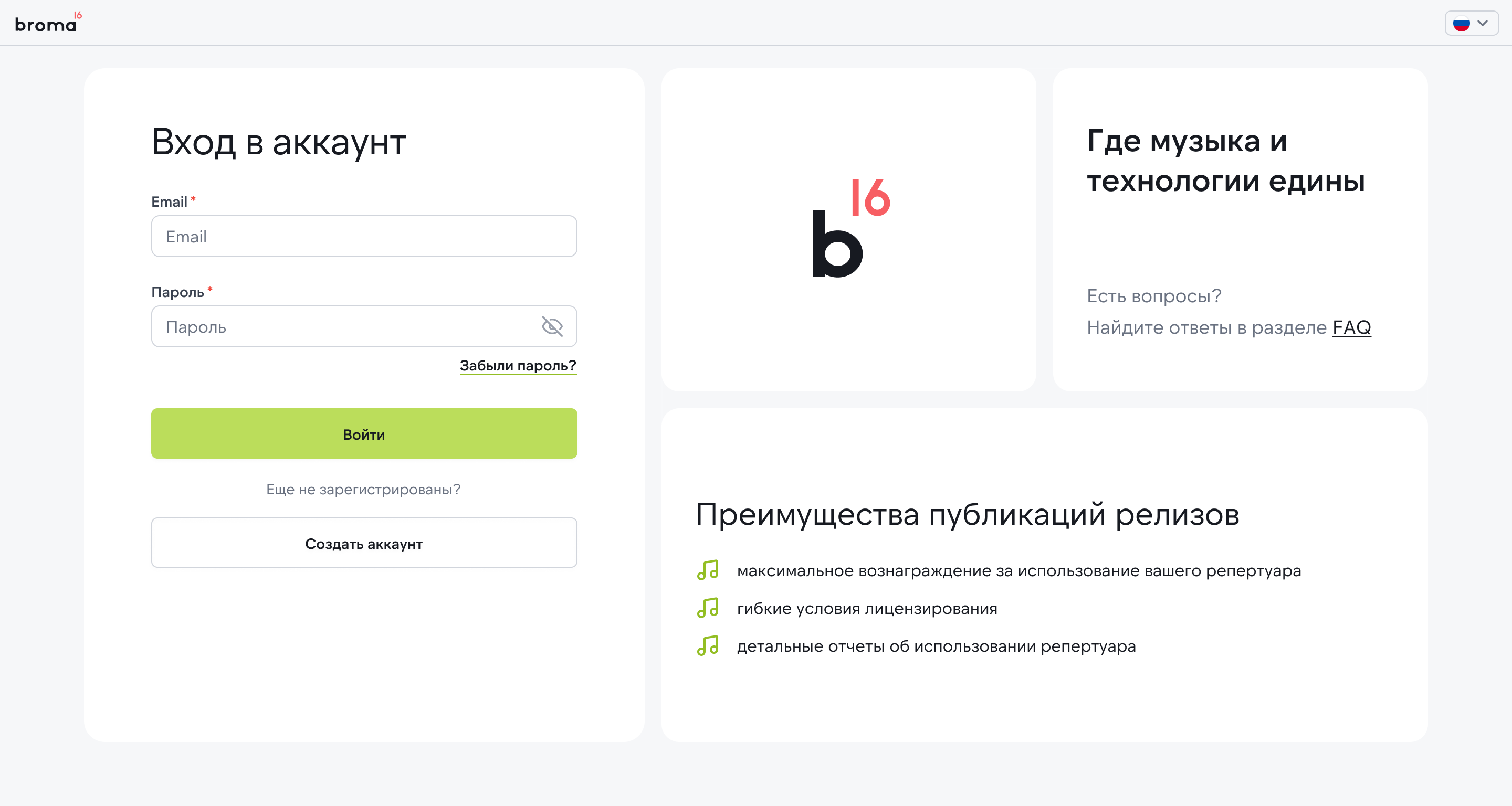 Broma 16 — независимая музыкальная компания, лицензирующая права на цифровой контент и выплачивающая вознаграждения авторам, исполнителям, лейблам и издательствам. Сервис объединяет более 600 правообладателей по всему миру и сотрудничает с платформами Apple Music, YouTube, Deezer, VK, Яндекс.Музыка и другими.